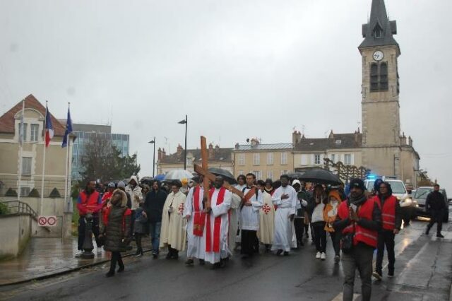 LE VENDREDI SAINT, 3 avril, le traditionnel chemin de croix itinérants traversant les rues du Mée et de Melun a réuni nombre de fidèles malgré la pluie.
